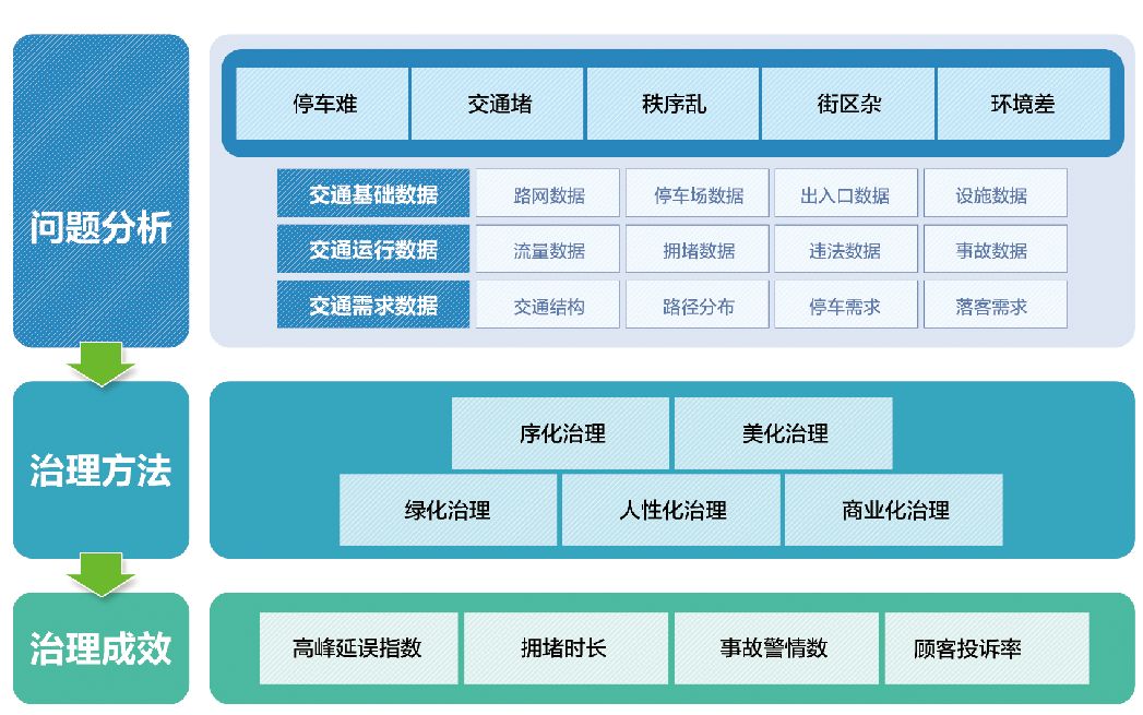 从商圈周边交通存在的实际问题出发,采用“1+X”治理方法,通过数据分析明确客流需求分布,抓住商业交通高峰虹吸的“1”这个主要矛盾,采用优化交通组织、动静态交通协同、构建网约车上下客系统、建立人性服务体系等“X”项措施,开展数治引领下的商圈五化治理,即序化、美化、绿化、人性化、商业化,实现从交通拥堵治理到空间环境提升的拓展。