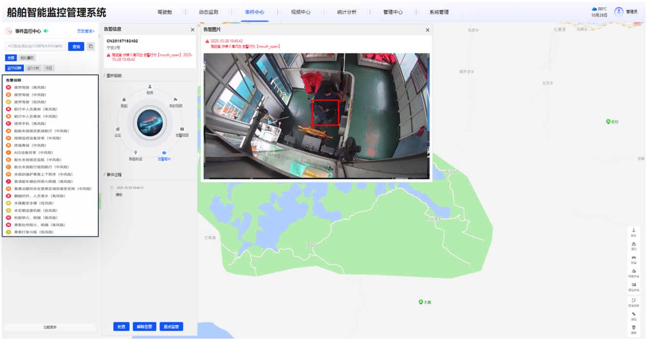 2)事件中心:实现所有船舶实时告警信息“一张图”,包括船舶档案、实时监控等,并对告警处置进行跟踪。