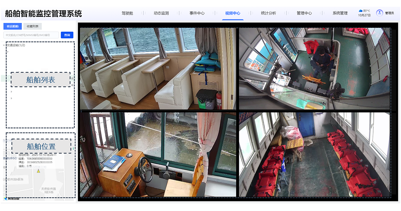 3)视频中心:提供船舶的实时监控调阅,支持视频叠加场景名称、船舶名称、定位坐标时间与航速信息。