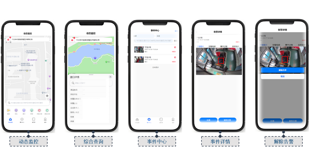 6)移动应用:支持手机实时动态监测船舶,查看渡口、码头等交通要素信息,以及对告警事件进行接收与处置。
